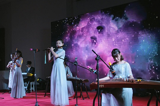 伴随着机械舞《当poping遇上光》的酷炫开场,全场观众的气氛被点燃。作为晚会不可或缺的元素,风格各异的舞蹈表演尽展公司学子的青春与活力。爵士舞《SUPERJAZZ》急促热辣富于动感,中国舞《清风月淳》柔美典雅长于韵味,二者对比强烈又相得益彰,极具感染力与表现力。拉丁舞《似火柔情》的表演者们热情奔放,舞姿曼妙,吸睛十足。民族舞串烧《远方的家》亦是精彩非常,各民族舞者们无不将浓浓的民族风情展现得淋漓尽致,引得全场喝彩连连。男女对唱《打错了》歌声婉约、喉清韵雅、余音绕梁;大合唱《最初的梦想》、小合唱《我们的小幸运》演唱者们配合默契、饱含深情,时而激情满怀一吐为快,时而温润如水娓娓道来,起伏有致,引人入胜。除歌舞之外,其他节目也是精彩不断,令全场观众目不暇接。诗朗诵《中华少年》,四位朗诵者声情并茂、富有激情,表现了当代青年报效祖国的坚定决心和豪迈情怀。相声表演《我的老员工活》,一捧一逗,生动再现了老员工活中的趣事,令人捧腹。小品《开学33天》,剧情幽默诙谐,演员们演技精湛,,带给现场观众的不仅是欢笑,更有满满的回忆和对未来老员工活的憧憬。乐器表演《器乐合奏》将西洋乐器与中国传统乐器巧妙结合,体现出表演者们娴熟精湛的技艺与默契的配合,让观众们沉浸在美妙的音乐世界里。晚会在歌曲《奔跑》的轻快旋律中圆满落幕。晚会中还穿插了三轮抽奖环节,幸运者与主持人互动,现场气氛轻松活跃。
