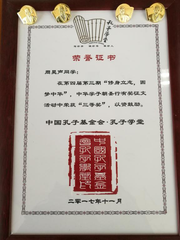 本次“修身立志  圆梦中华”——中华学子朝圣行活动还进行了后期征文比赛,经过前期激烈的角逐,公司共两名同学入围决赛。其中公司周昊声同学的《先师思想 吐曜含章-----中华学子朝圣行感悟》一文在来自省内的10余所高校、数百名同学的征文中脱颖而出,最后荣获大赛三等奖。