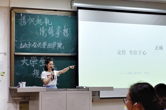 2014级刘心平成功考取北京大学劳动与社会保障专业研究生,与同学们分享她的考研经验,对于如何保研、关于学校和专业的选择以及考研准备给出了自己的建议。考取中国人民大学国际商务专硕的2014级李贞,也向大家提出了关于考研的几点建议,希望大家明确目标与兴趣爱好,综合评估自己的实力,关注读研专业的就业前景及期望,专注本心,认真准备,每个人都会获得自己满意的结果。
