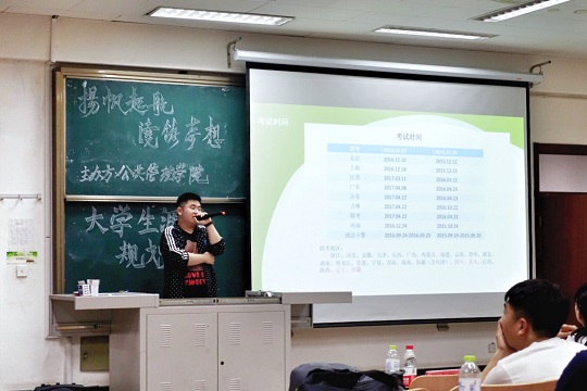 交流会上,成功考取东营市国税局的2014级陈占华为大家做了“打好行囊,为梦出发” 的考公经验交流报告, 分别从报考时间、报考条件、笔试内容、备考建议四个方面做了介绍,并为同学们细致答疑。考取菏泽鄄城县国税局的2014级王润对考试内容进行了更深层的解析,通过具体真题展示对笔试内容中的常识判断、言语理解与表达、数量关系、申论等进行了阐释,并介绍了国家各部门的面试时间以及面试的具体问题,给出面试的应考建议,同时就大家所关心的关于考公务员的热点话题做出相关回答。