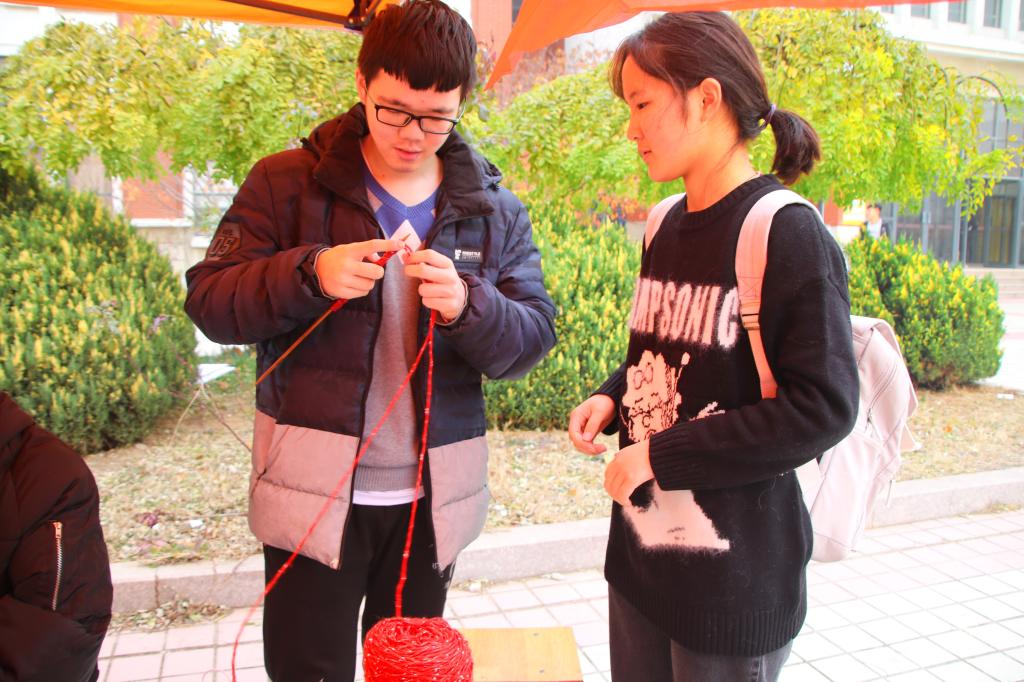 在路演活动现场,同学们积极参与,志愿者们热情引导,气氛十分热烈。志愿者们首先就活动目的和内容为前来参观的同学进行讲解说明,并鼓励他们进一步了解本次活动。现场准备好了粉色和白色的爱心卡片,以及收集爱心寄语的留言箱。许多同学纷纷领取纸笔,认真构思并写下暖心激励的话语。一旁摆放着粉白与朱红色的毛线,旁边两位志愿者手拿针线,对前来学习的同学进行现场针织教学。志愿者手中针线翻飞,柔暖舒适的毛线帽已见雏形。