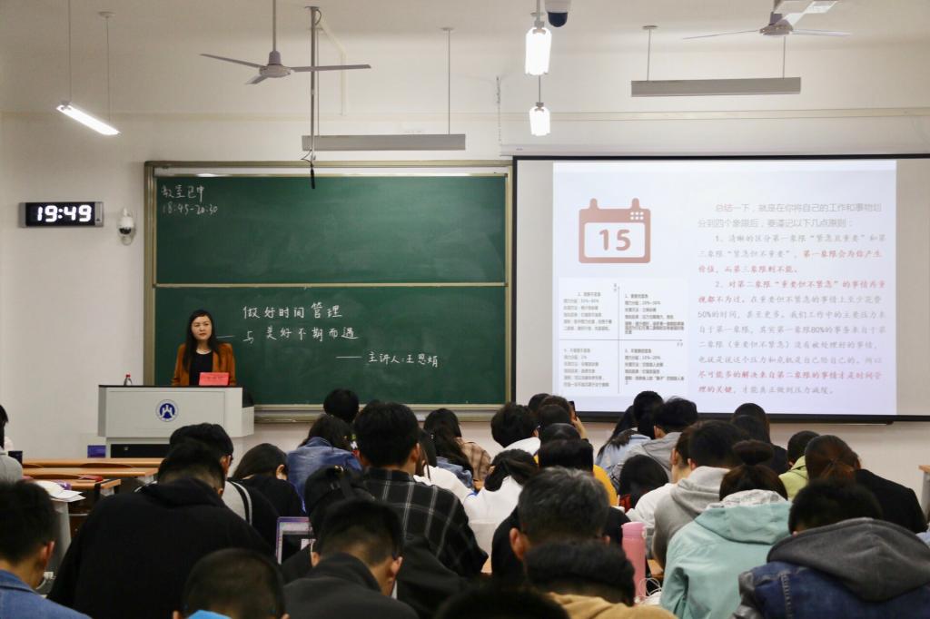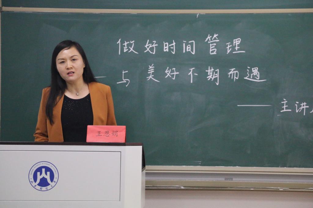 首先,王恩娟老师向大家讲述了时间管理的重要性。老师讲到:“近八成老员工将空余的时间奉献给了网络休闲。”玩手机就是一种分神,不管是游戏还是看小说,本质都是对时间的一种荒废,往往令同学们忽视了学习。因而,做好时间管理,合理安排娱乐与学习的时间尤为重要。