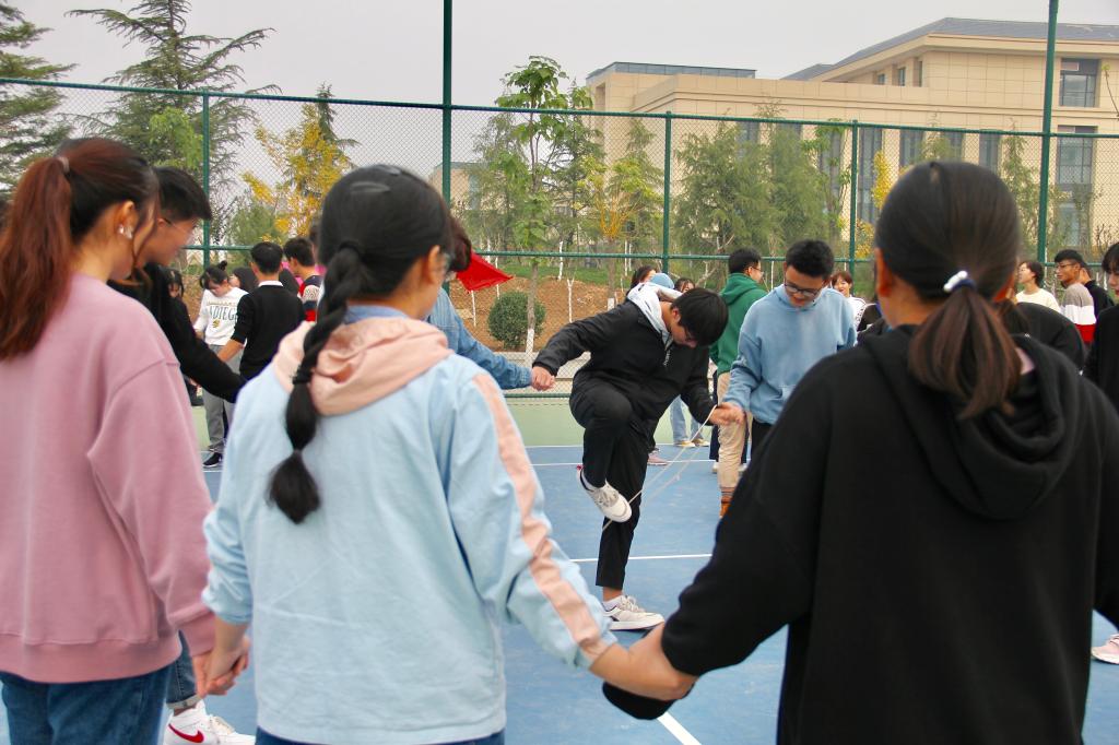 本次素质拓展以小组为单位,共设置了“名字接龙”、“翻纸牌”、“背夹数”、“穿越绳圈”、“袋鼠跳”以及“五毛一块”六个项目。各队队员积极参与,一项项看似简单的游戏,却揭示了深刻的道理,同学们在体验式学习的过程中,增进了彼此之间信任感与责任感,增强了自信心、沟通能力、领导能力和团队合作能力。