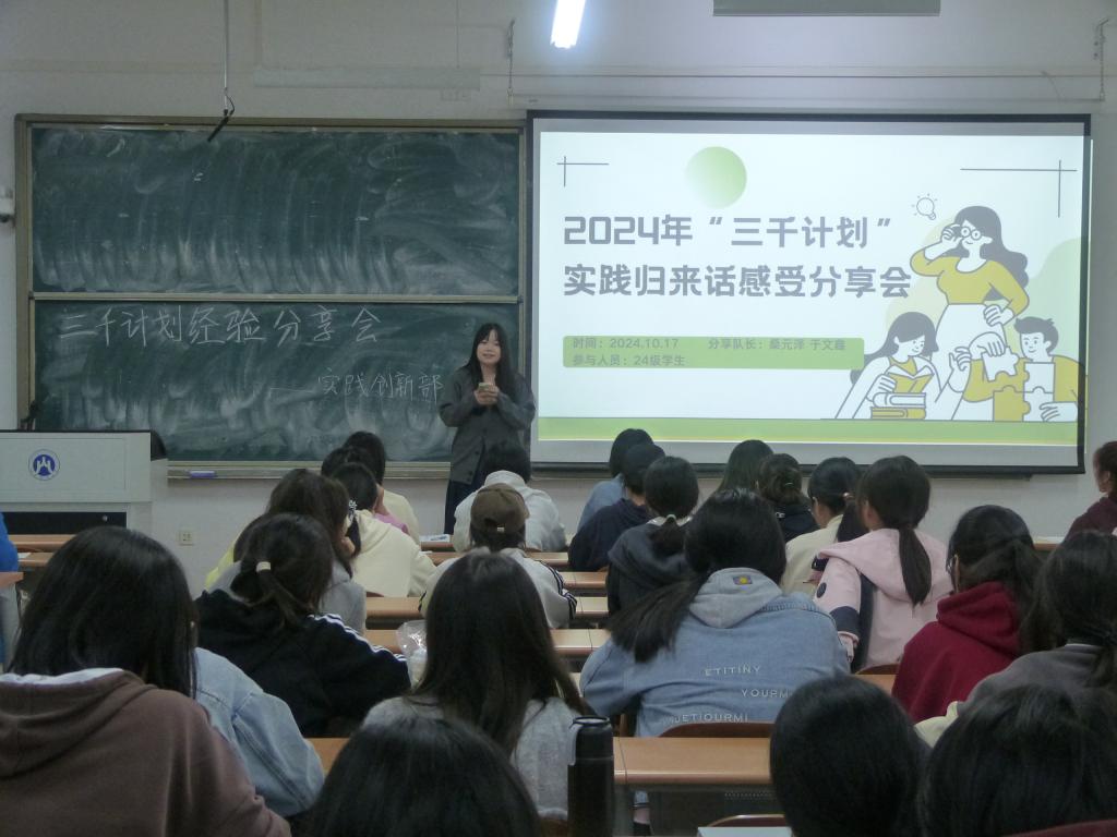 (通讯员 张心仪 摄影 李小茹)为深化员工对“三千计划”社会实践活动的了解,进一步发挥专业优势,涌现更多优秀的调研团队。10月17日晚,学院于圣井校区8-102教室举办了“三千计划”经验交流分享会。此次活动由学院实践创新部组织,2024级同学参加。